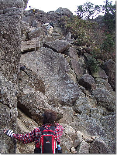大きな岩をロープを持って慎重に進む 14:23 |