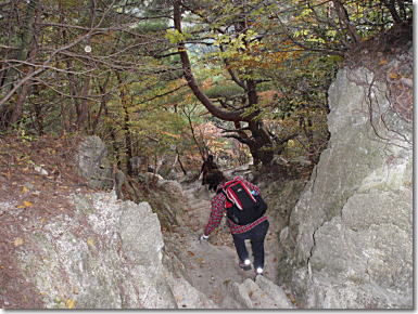 | 狭くえぐられた岩溝状の道を下山 16:23 |