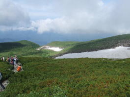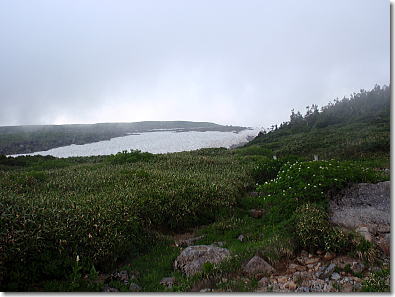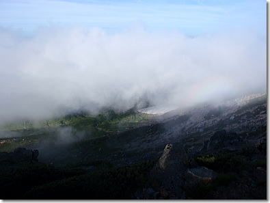 | 山頂から、雪渓を見下ろす・・虹が微かに 6:30 |