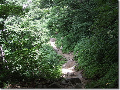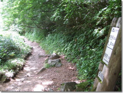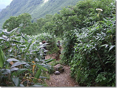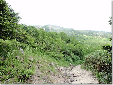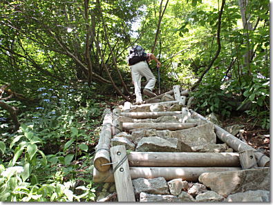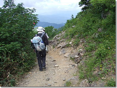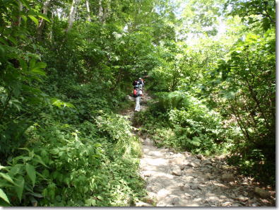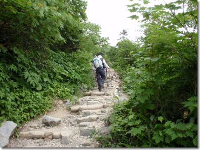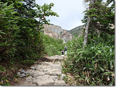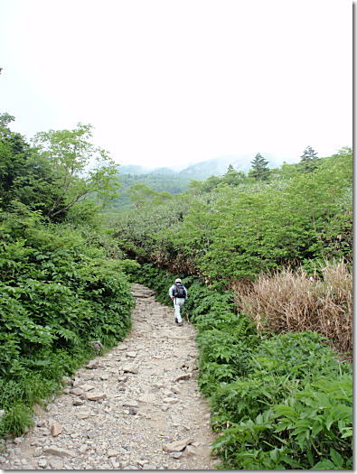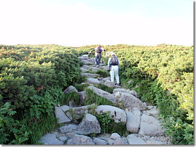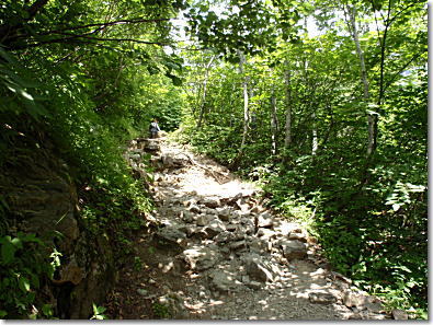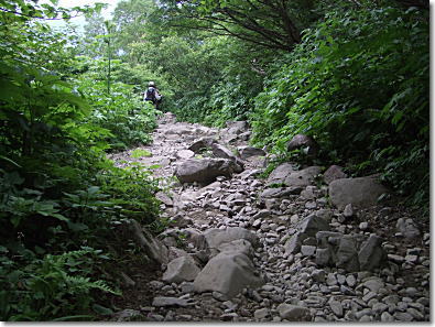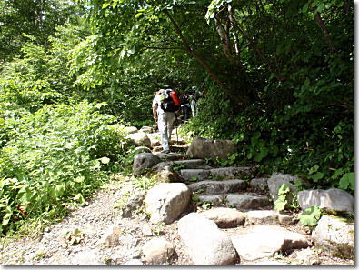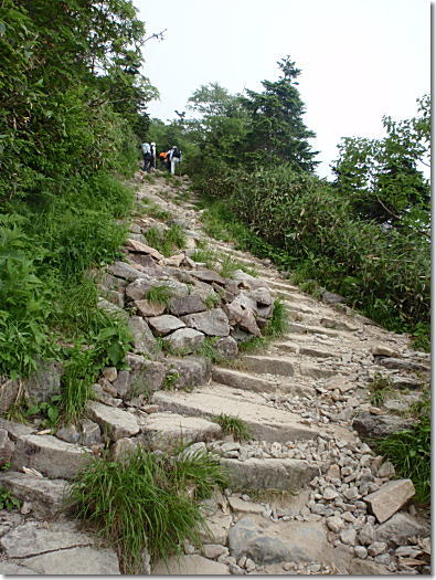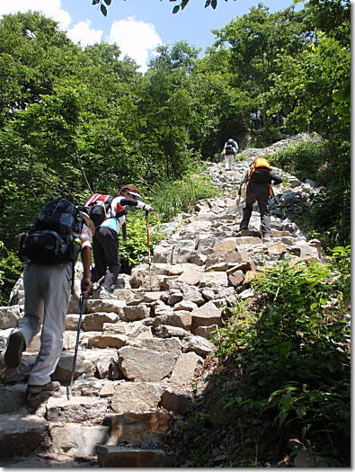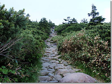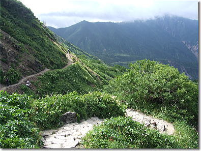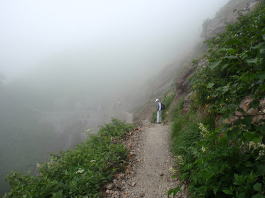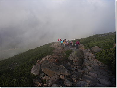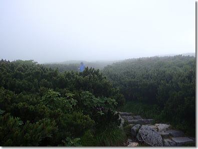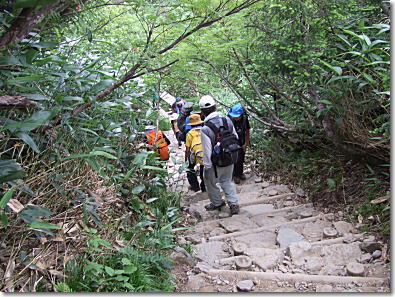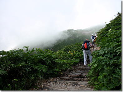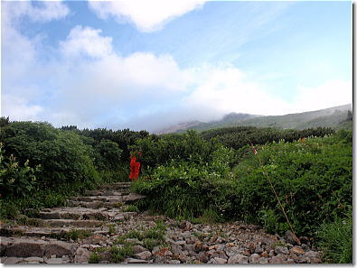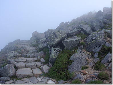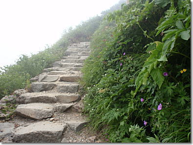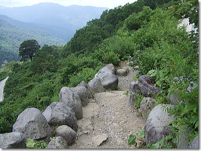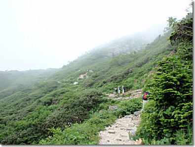 石畳の急坂を下山・霧が少し晴れ(カメラの電源を