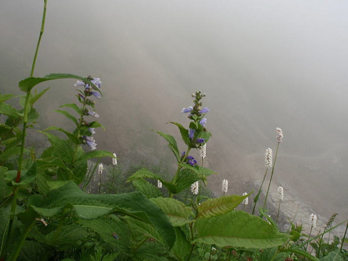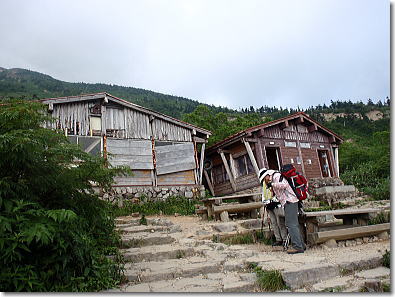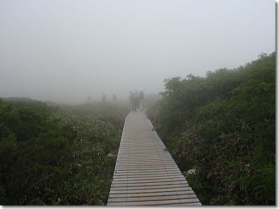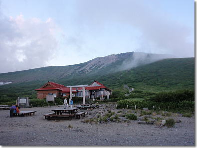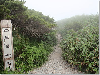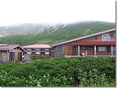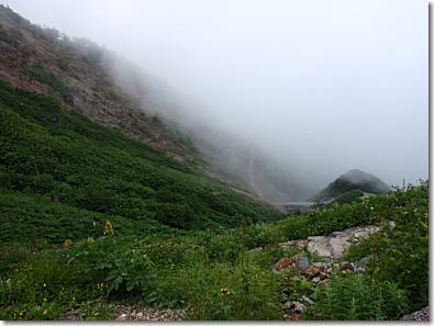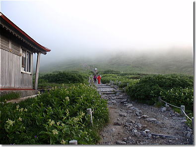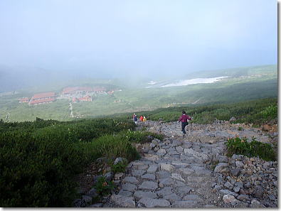 白山・室堂を振り返る。山頂・御前峰は霧の中