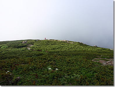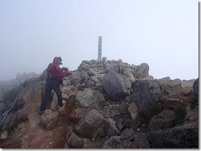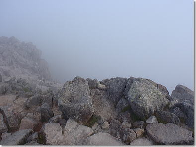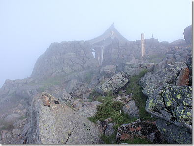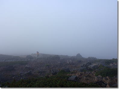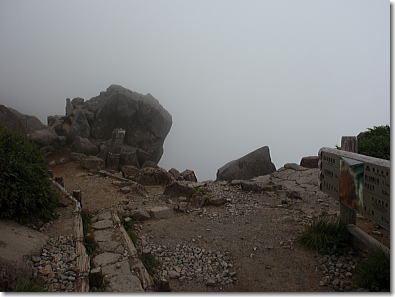 その中でも最高峰なのがここ御前峰の頂上であるが、周囲は霧で何も見えず |
