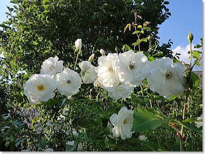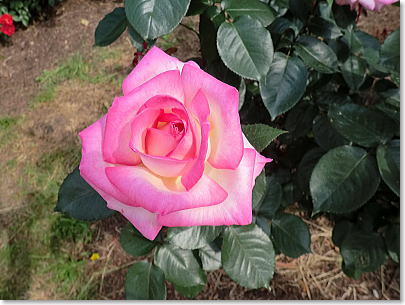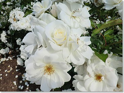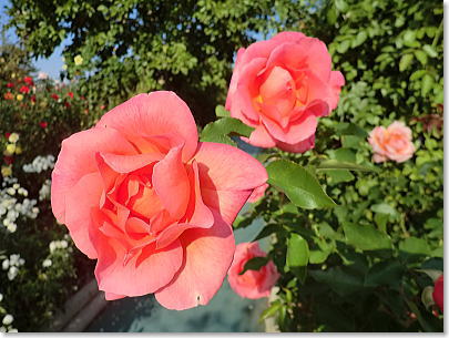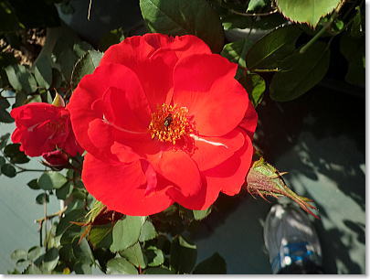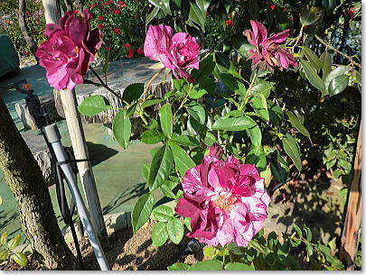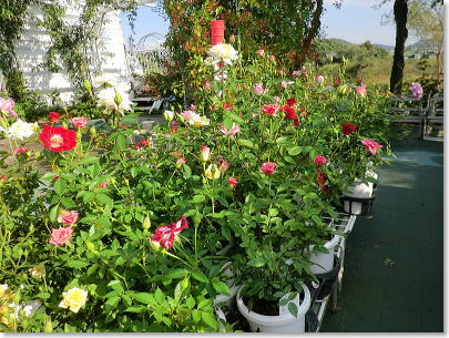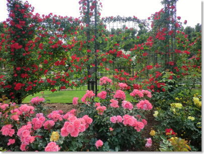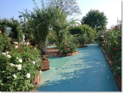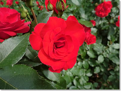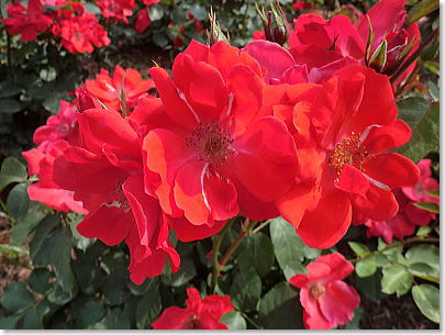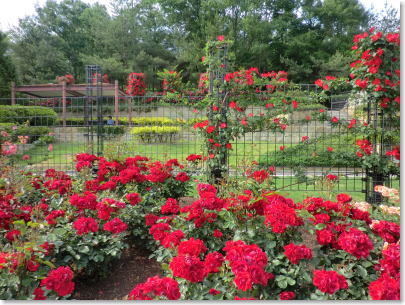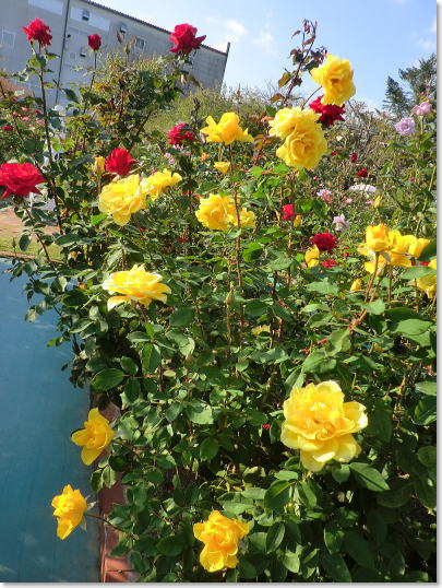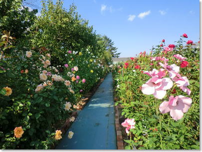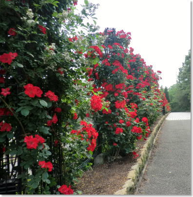 バラ園への遊歩道 真っ赤なバラが満開 |