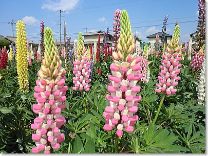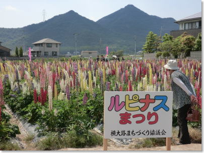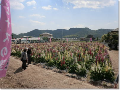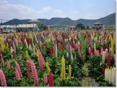 | 2012年5月18日、加古川市志方町で色鮮やかなルピナスの花が満開と知り行ってきました。ルピナスはマメ科の植物で花が藤に似ているため「ノボリフジ」とも言われ、赤、黄、白、紫と色鮮やかに咲き、高御位山を背に垂直に槍を立てたような独特の光景を見ることが出来ます。。平日にも関わらず大勢の人が訪れて賑わいを見せていました。花は6月初めまで楽しめるそうです。 |