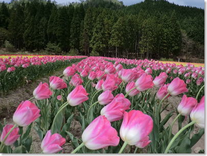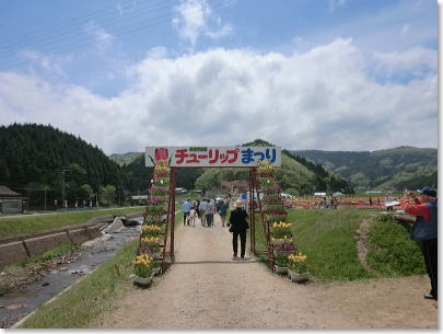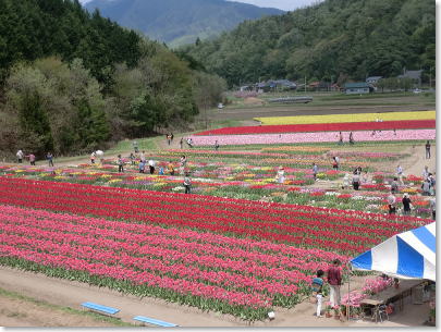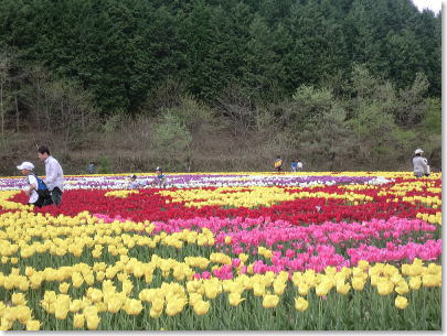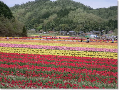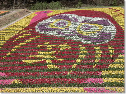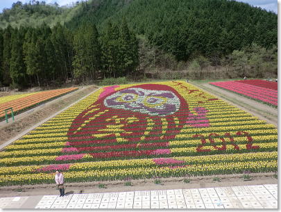 2012年5月1日、但馬の春の風物詩となった「たんとうチューリップまつり」(4月25日〜5月6日開催)。に行ってきました。1992年から毎年、豊岡市但東町畑山のチューリップ畑で開催されています。行くのは初めてです。イベントのメインとなっているのは「フラワーアート」。毎年約10万本のチューリップを使って、畑一面にその年のアートが描かれています。今年は「元気だるま」です。