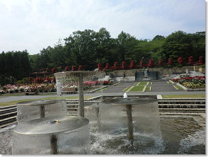 噴水を囲むように植えられた華麗なバラを楽しめます。