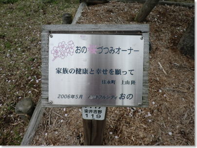 オーナー制で植樹され銘版には出産記念や結婚記念などメッセージが。