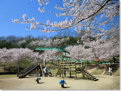 山頂から爽快に滑り降りる2本のローラー滑り台やアスレチック、ふもとには水辺のプロムナードの親水空間があります。春には桜の園として親しまれています。 |