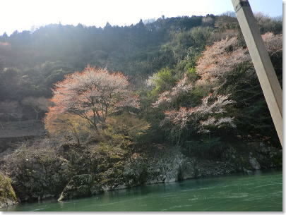 舟下り終点嵐山・・・山がピンクに・・・・ |