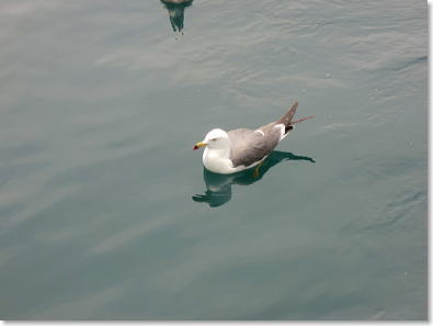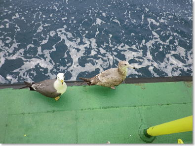| 船の縁に止まり餌を求める横着なカモメもいます。 |