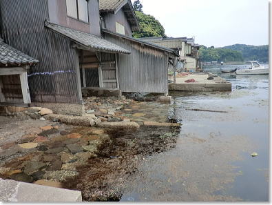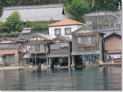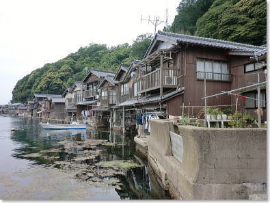 | 舟屋が直接海に面して建ち並ぶ風景は壮観です |