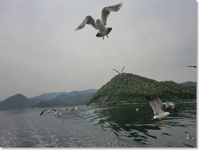 船の周りを餌を求めて飛び交うかカモメ・・・・