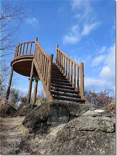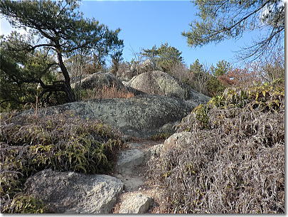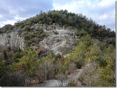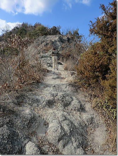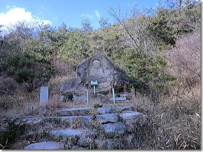 | 古法華自然公園に一旦下山し、石彫アトリエ館で彫られた石仏が並ぶ道を進み、七福神の横から山頂へと・・・進むはずが横道にそれてしまい、イバラ道を進むはめに途中登山道と無事合流。山頂へと進む。 |