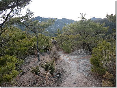 | 笠松山の山頂から善防山山頂へと、ゆったりと延びる岩稜です。ところどころ低木がしがみついているとはいえ、360度広がるパノラマ。山頂からは、ため池、水田など加西を象徴する風景が一望できます。 |