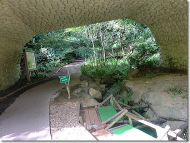 あしみず場はカツラの巨木から約100メートル下流にあり、県道の陸橋下に設置座席の周りに丸太で手すりなどを設けており、速い水の流れにも安心して足をつけられるように配慮されています。。