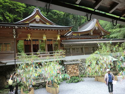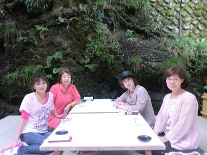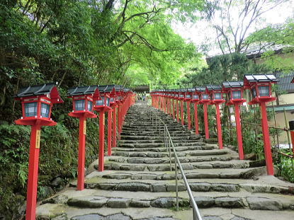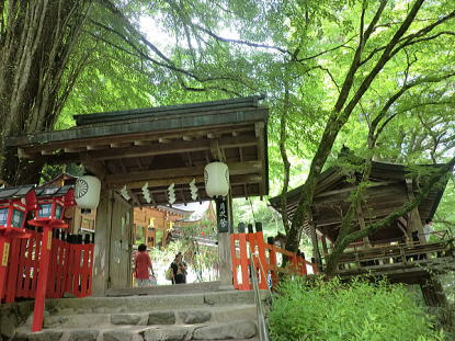 | 街中での暑さが嘘のような清々しい空気が漂う「貴船の川床」。貴船川の清流の水面より数十センチに作られた川床はまさに「天然クーラー」の中に居るかのようです。青々とした木々に囲まれた自然の中での食事は最高でした。 のんびりした後、貴船神社お参りです。 |