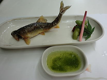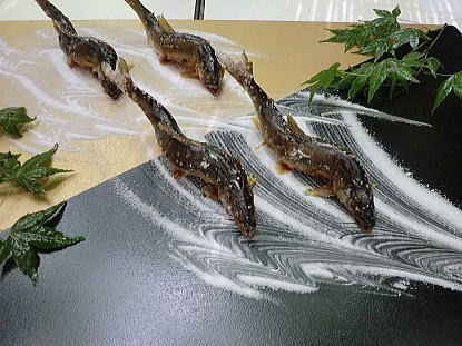 鮎の塩焼き・・塩の波の中で泳いでいます。 |