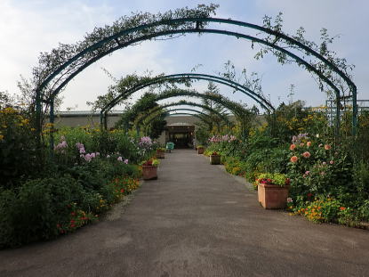 花の庭・・バラを絡ませた6つ大アーチをくぐるとショップ