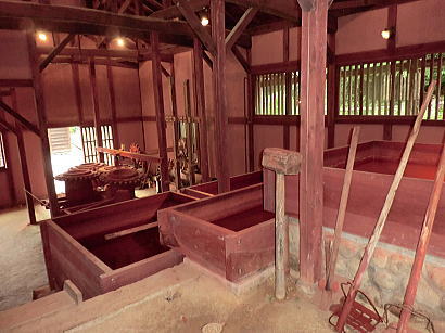 江戸中期以来、吹屋の繁栄を支えたベンガラ工場を復元(明治時代の姿)。往時にはこの谷あいにはベンガラ工場が4ヶ所ありました。往時の製造工程や活況を呈した町の姿も展示により知ることができます。隣接するベンガラ陶芸館では、ベンガラ焼きの土ひねりと絵付けの陶芸教室を開講されています。(要予約) |