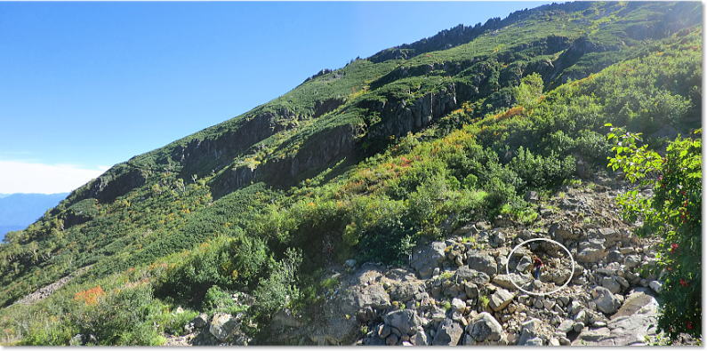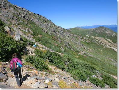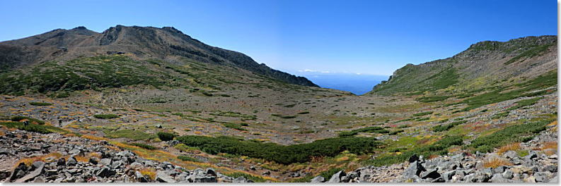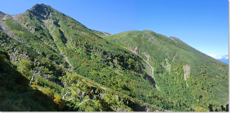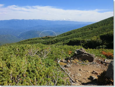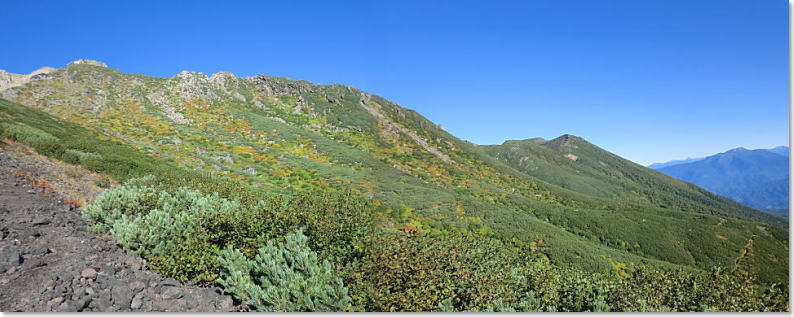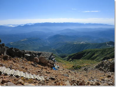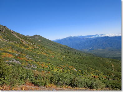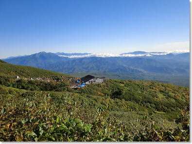 | 石室山荘への登り途中乗鞍岳を遠望 8:55 |