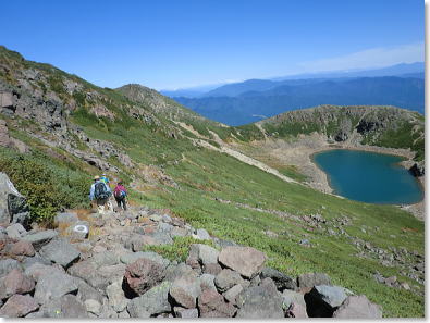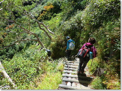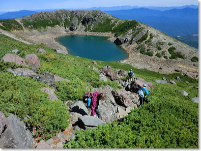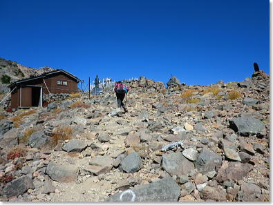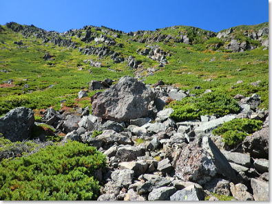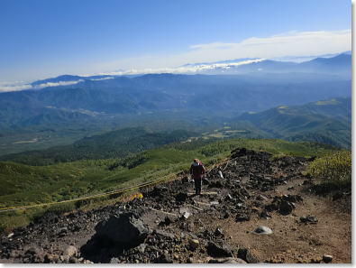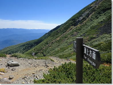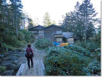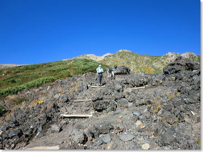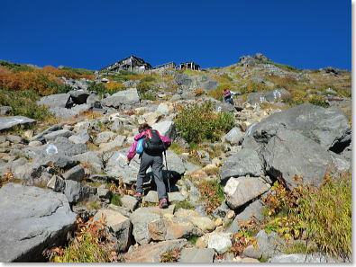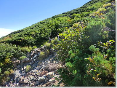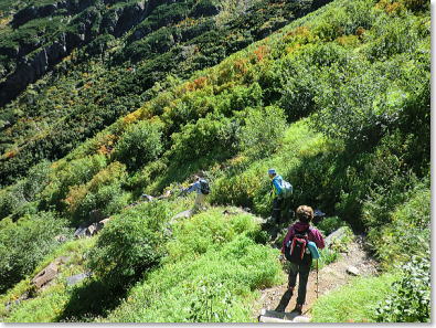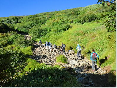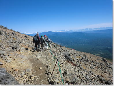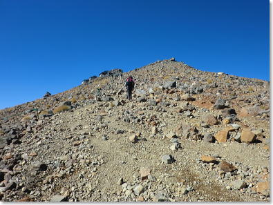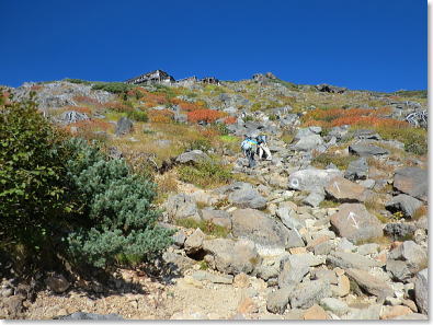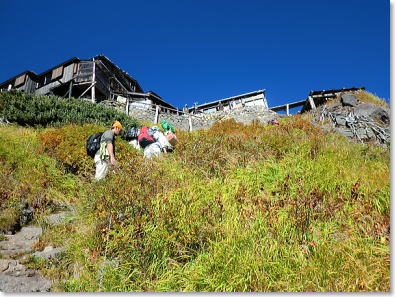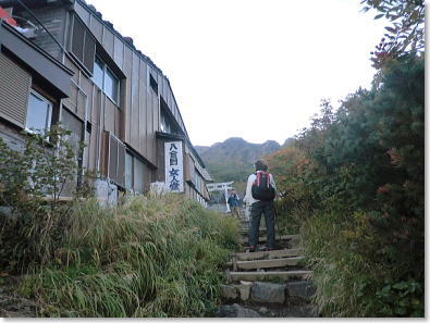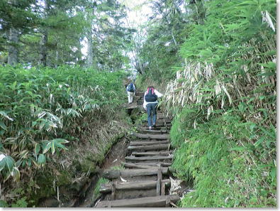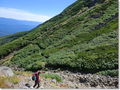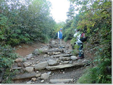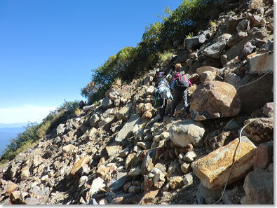 山小屋のお兄さんが途中まで迎にきてくれ、苦しい歩きになりました。 |