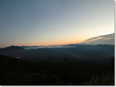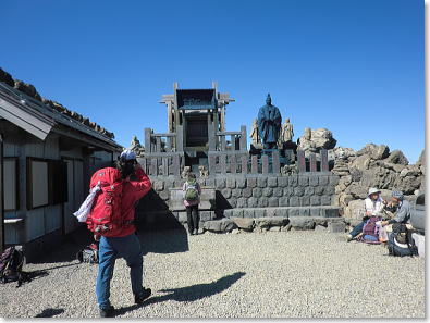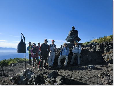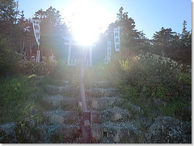 女人堂でのご来光は雲がかかりちょっぴり残念。山頂に向けて出発時には雲ひとつない晴天です。
