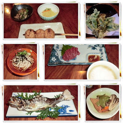 養老蒸し・煮物・季節の天ぷら・蕎麦・ニジマス |