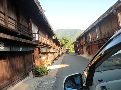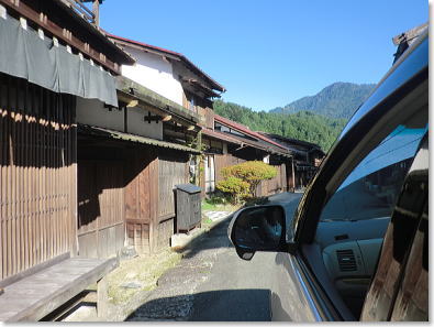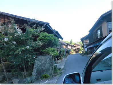 早朝の妻籠宿を車で走行。どのお店も開いていません。観光客の姿も皆無です。 8:00