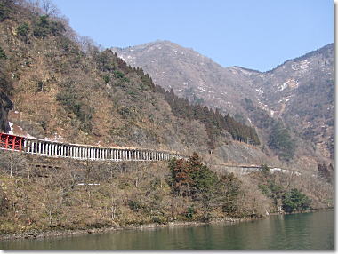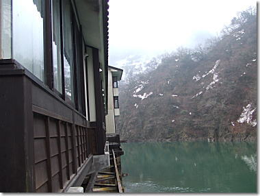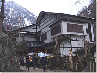 | 昨日の雨もあがり、晴天です。お宿の人のお見送りを受け、五箇山・村上家、流刑小屋、白川郷散策です。山裾に長く続くコンクリートの柱の中は雪よけの五箇山に続く道路でした。 |