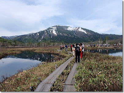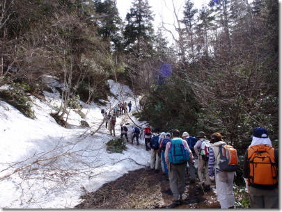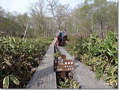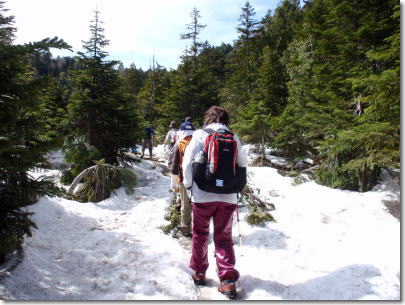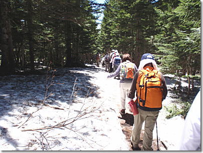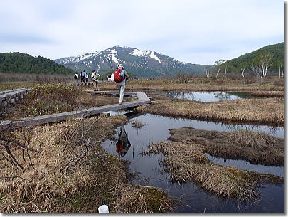 沼山峠から尾瀬沼まで約3キロ、1時間20分ほど雪が多く残った中の歩きでした。 |