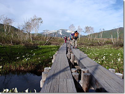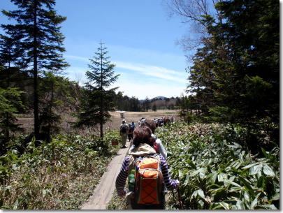 水芭蕉の群生、可愛い山野草、尾瀬ならではのハイキングを楽しみました。(約9キロ・約5時間30分) |
