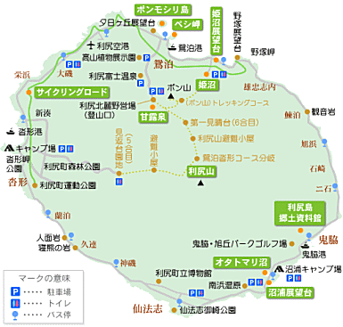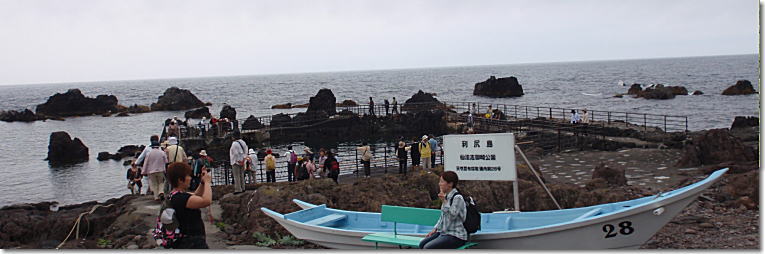 | 利尻島最南端、仙法志(せんほうし)岬にある、自然の磯を利用した自然公園。 利尻山の噴火で海に流れ込んだ溶岩流が織りなす猛々しい岩場や、季節の花々、利尻山といった風景を楽しむことが出来る公園です。公園には溶岩流でできた荒磯を仕切って作った天然の自然磯観察場がありました。 |