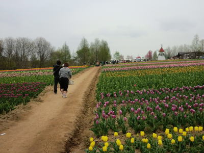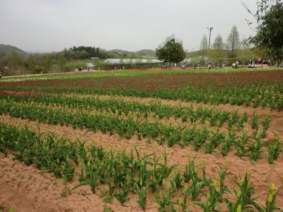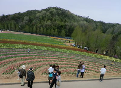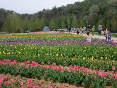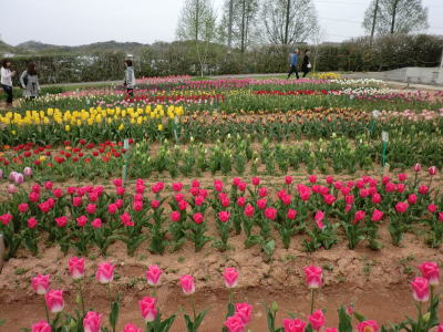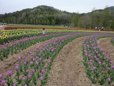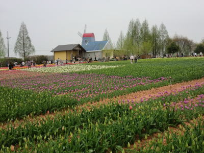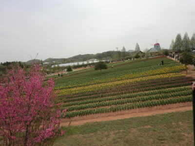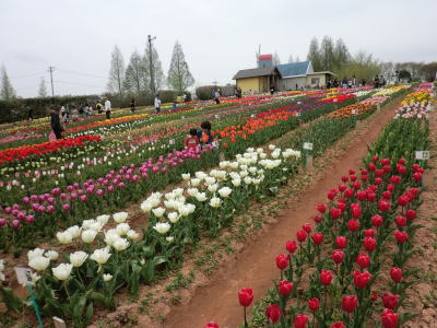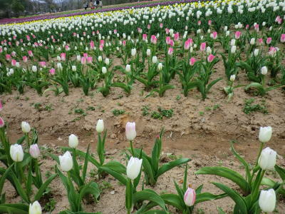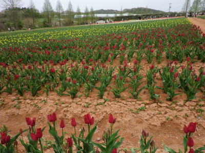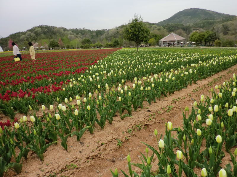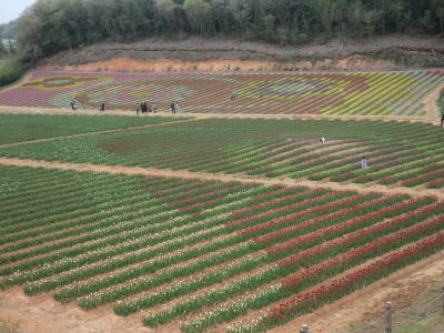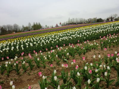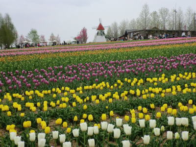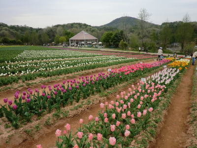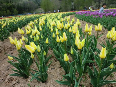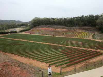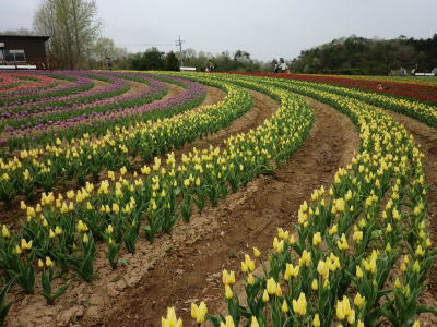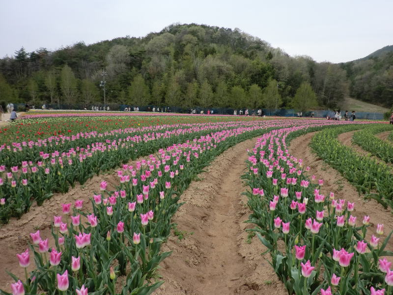 広島県の世羅町別迫にある観光農園で中国・四国地方最大級のチューリップ畑。花畑は広さ約6ヘクタールに300種70万本に及ぶチューリップが毎年デザインを変えて栽培されています。又、チューリップは色や種類ごとに帯状に植えられ、丘陵の段差を利用しての絶妙な配色が楽しめるようになっています。
