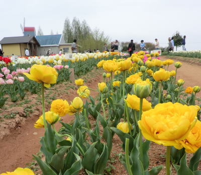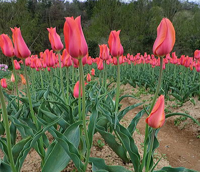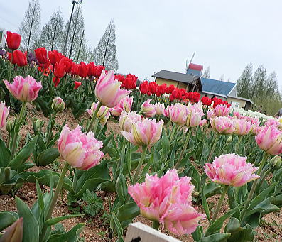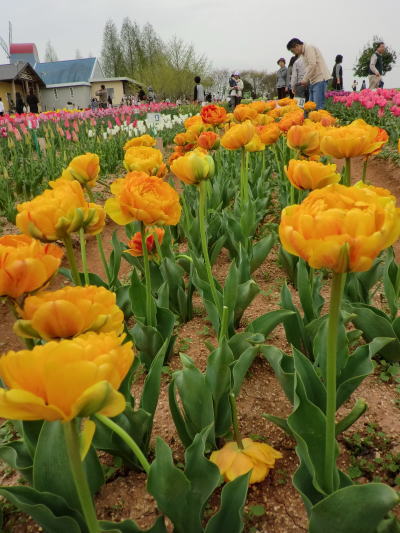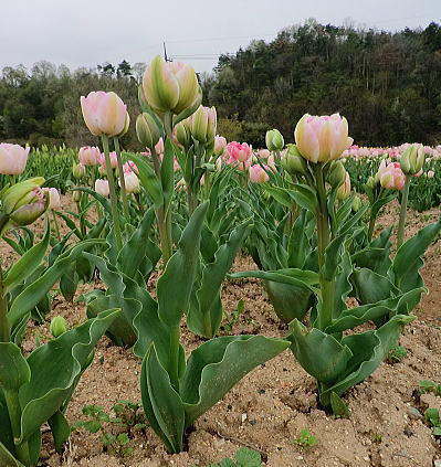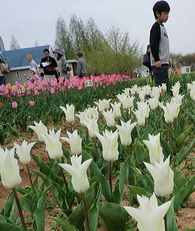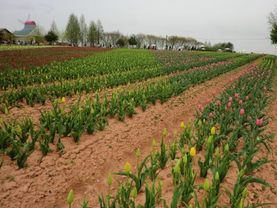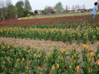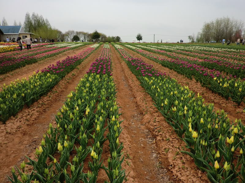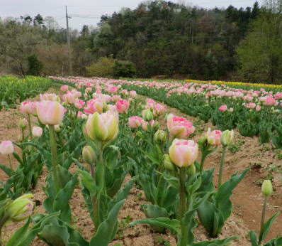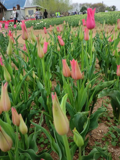 | 虹の畑・・・ピンクのチューリップは満開です。お隣は蕾。 |