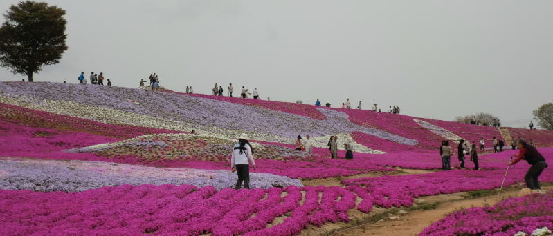 | 赤、ピンク、白、紫の4色の芝桜が、およそ5万平米の敷地に埋め尽くされていて圧巻です! |