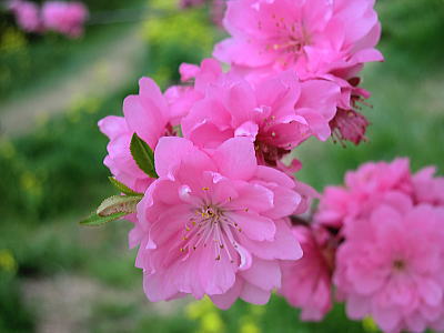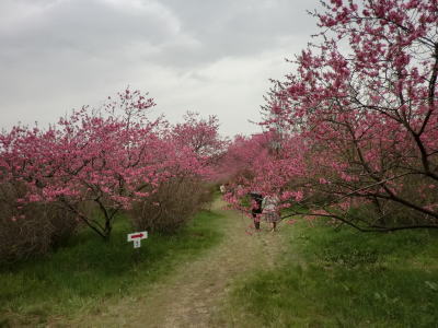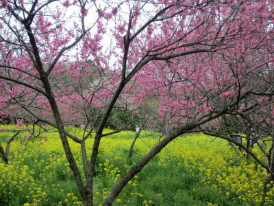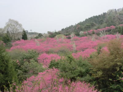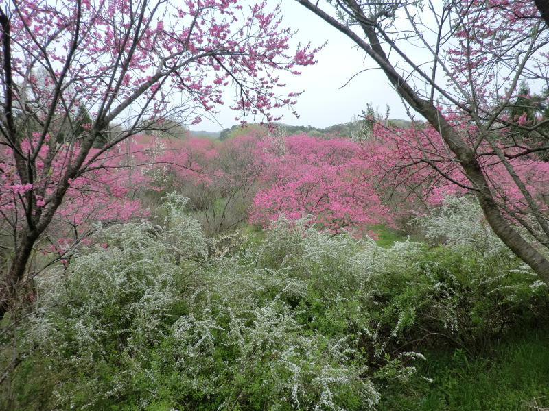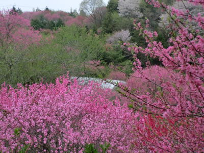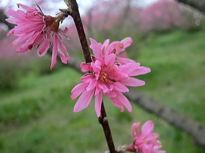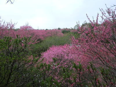 | 花夢の里の次は菊桃の丘です。菊桃の丘は、3ヘクタールの園内に菊桃の他、矢口桃、しだれ桃、白桃、源平桃、花桃が約1000本咲き誇り、丘一面をピンク色に染め、まさに桃源郷そのものです。黄色の菜の花や、白くこぼれるユキヤナギの小路、若草を踏みしめながら…1周約1kmあり、案外広い観光農園でした。 |