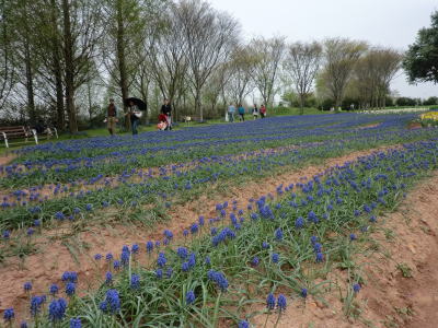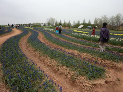 | 入園口すぐにアートガーデン・・・青紫が鮮やかなムスカリと黄色い水仙で川が描かれていました。 |