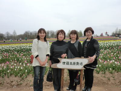 チューリップの前で記念撮影です  |