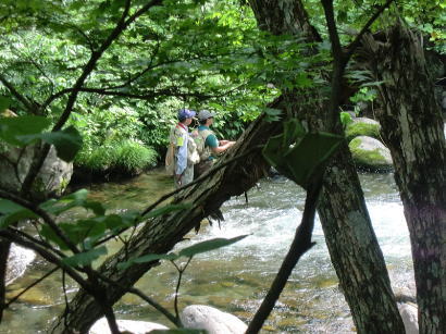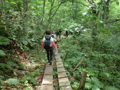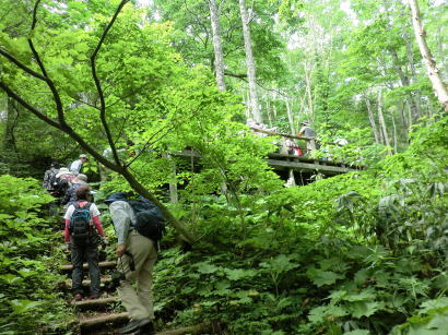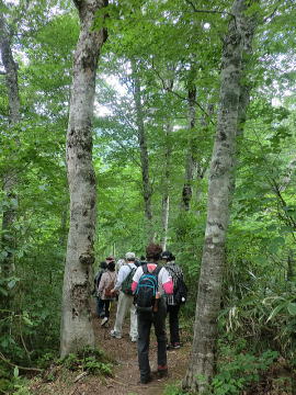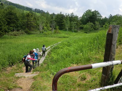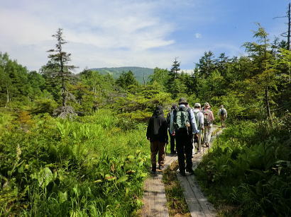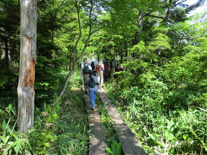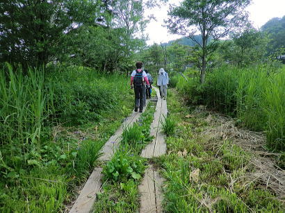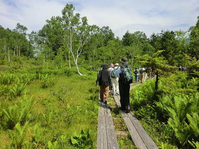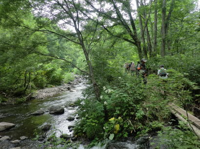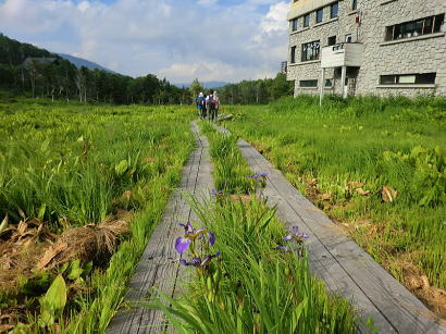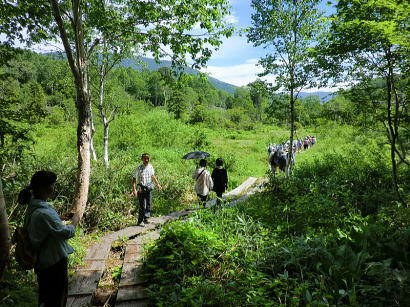ガイド同行で一ノ瀬ダイヤモンド湿原、樹齢800年シナノキをめぐるハイキングです。小雑魚川に沿った木道の散策路。途中にいくつもの湿原があり、四季を通じて湿性植物の花々が咲き乱れる様子を楽しむことが出来ます。イワナ原種保存地区でもあり、澄みわたる川で泳ぐ魚たちも観察できます。 |