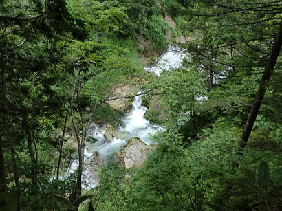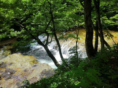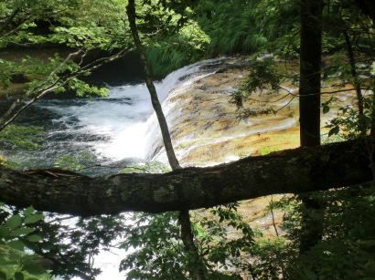 | ハーモニカの滝・ 川幅いっぱいに広がった一枚岩盤を流れ落ちる滝。その形状から釣り人がこの名を付けたそうです |