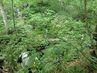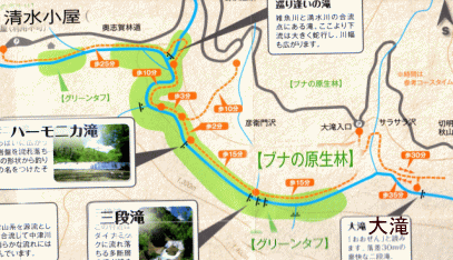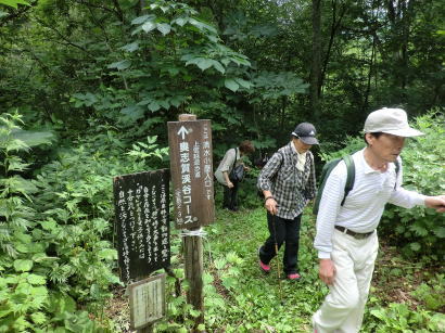 右側 三段滝・ハーモニカ滝方面へ進みます。入口の看板からコースに入り上流に向かい、再び林道に出るまで約2時間のコースです。 |
