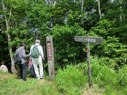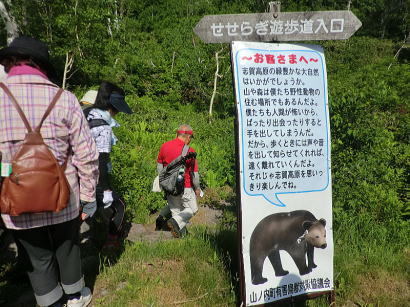 | 軽く運動後、せせらぎコースへと遊歩道入口・・・熊さんからの一言・・山」や森は僕たち野生動物の住む場所でもあるんだよー。僕たちも人間が怖いからばったり出会ったりすると手を出してしまうんだ、だから歩く時は声や音を出して知らせてくれれば遠く離れていくんだよー |
