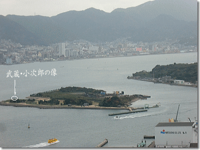 海峡ゆめタワーから巌流島武蔵、小次郎決闘の地を望む