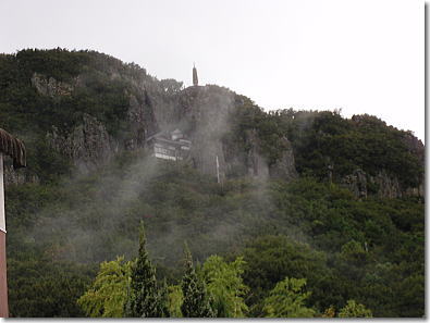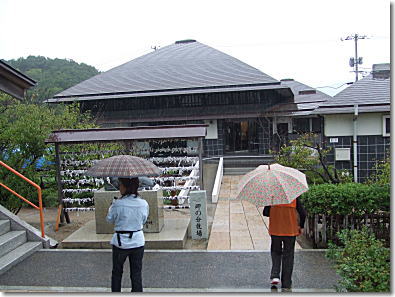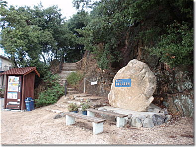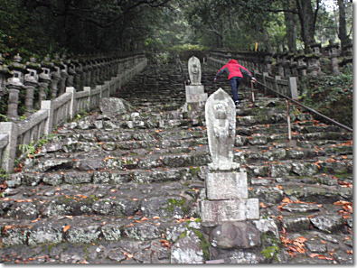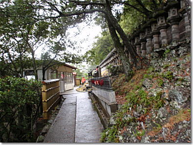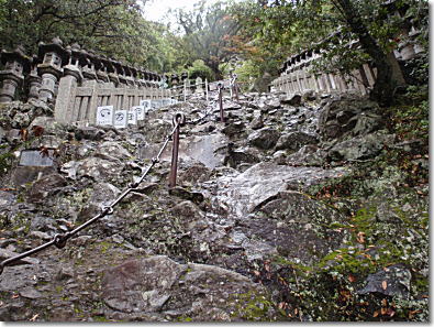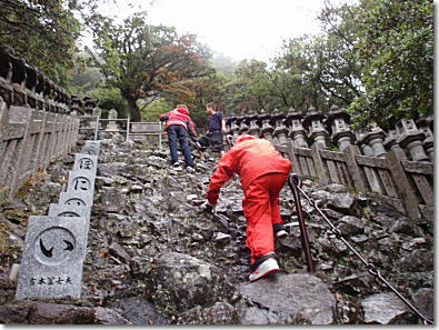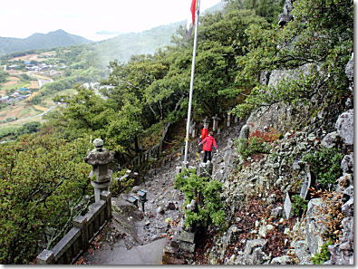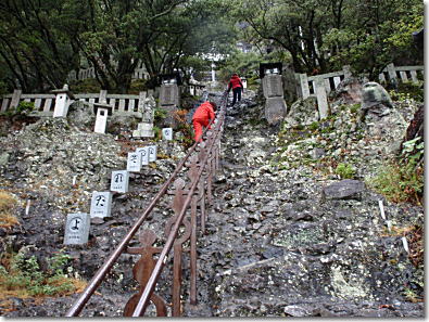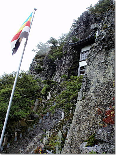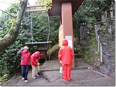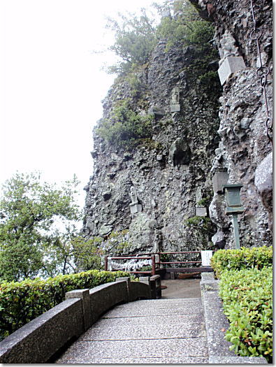 小豆島を訪れた第一目的は小豆島八十八ヵ所第72番奥の院・笠ガ滝寺です。朝からの雨もほとんど上がり、岸壁を鎖にすがってよじ登っていきます。(島に伝わる伝説によると、昔この山には白黒竜王がいて、四方をにらみ平和を維持し、また養女に変わり村人の苦難を救済したという)