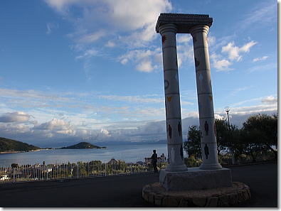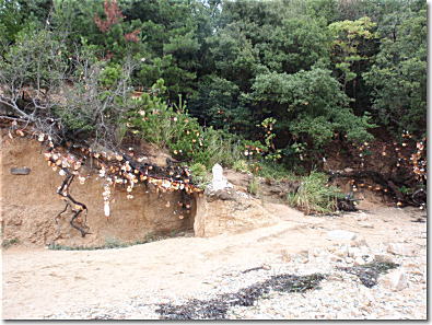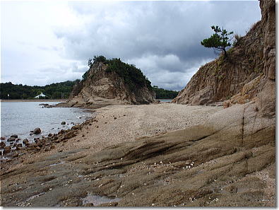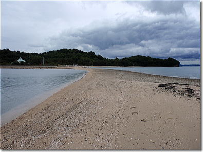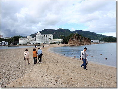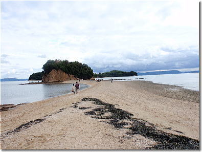 「エンジェルロード」とは大小4つの島々をつなぐように、干潮時に現われる砂の道のこと。干潮時にはその道を歩いて島を渡ることができます。砂の道を大切な人と手をつないで渡ると幸せになれるというジンクスがあり、映画やテレビドラマ(おふくろ先生診療日記3)のロケ地にもなっています。すぐ横の丘にはエンジェルロードを見下ろせる「約束の丘展望台」が立てらて幸せの鐘を鳴らすことができます。私達も幸せを願って渡って行きます。