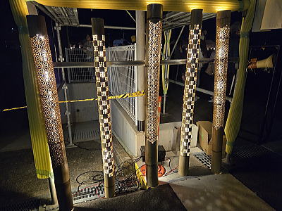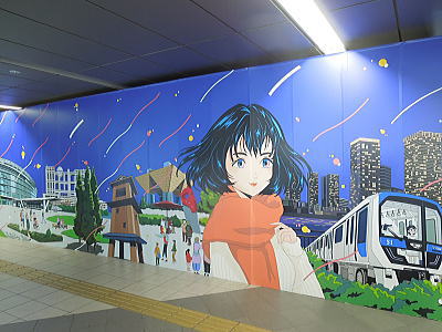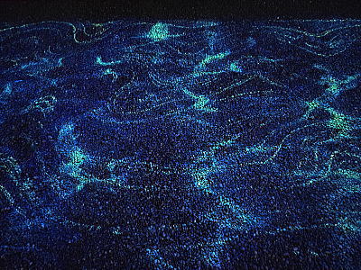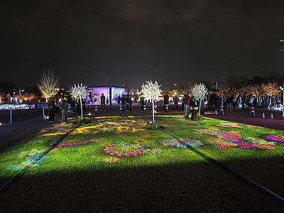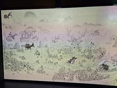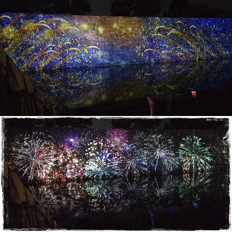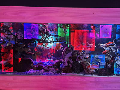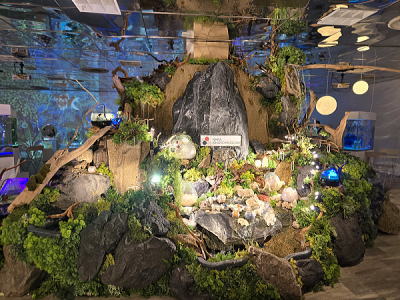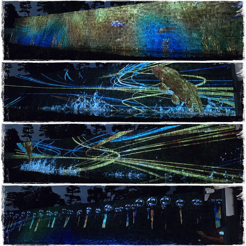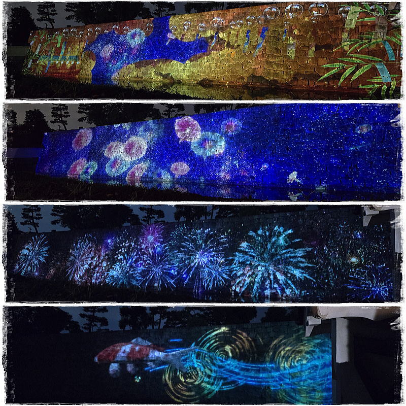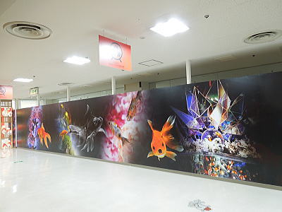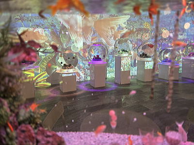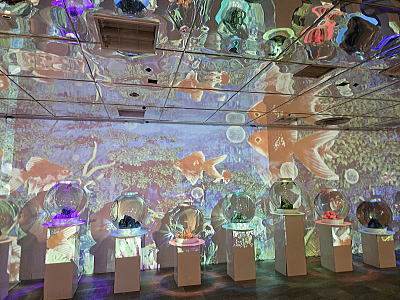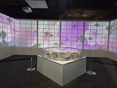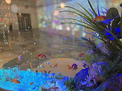 | 横幅12mの壁面に水中、森林、色鮮やかなファンタージプロジェクトマッピングを背景に泳ぐ金魚たち |