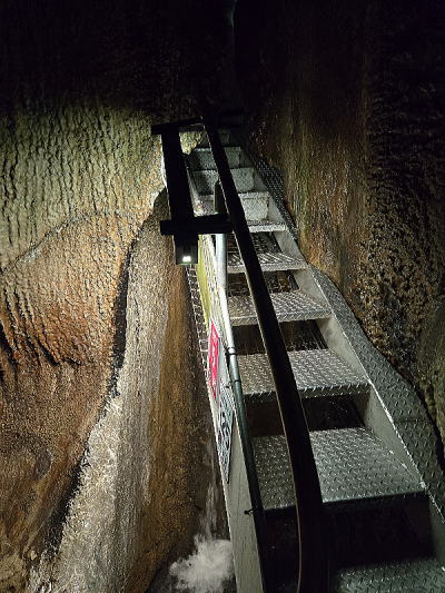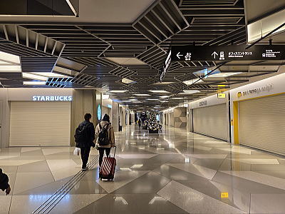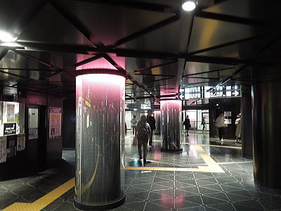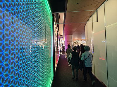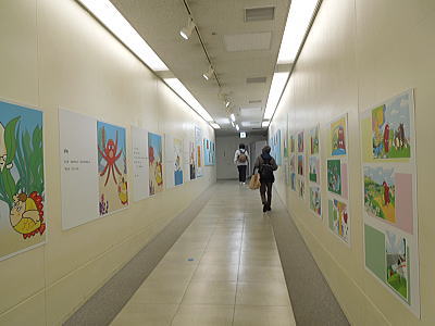 通路の壁にはめ込まれた円柱のアクアリュウム |