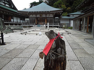 南無大師遍照金剛と書かれた赤い涎かけをしています |
