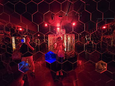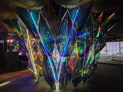 | 上部から侵入した光が内部で反射し輝きを漂わせるブリリアンカットを採用した世界初のダイヤモンドカットの水槽が展示。 |