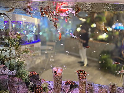 その中で泳ぐ金魚たちは優雅で、アートの一部になっています。 |